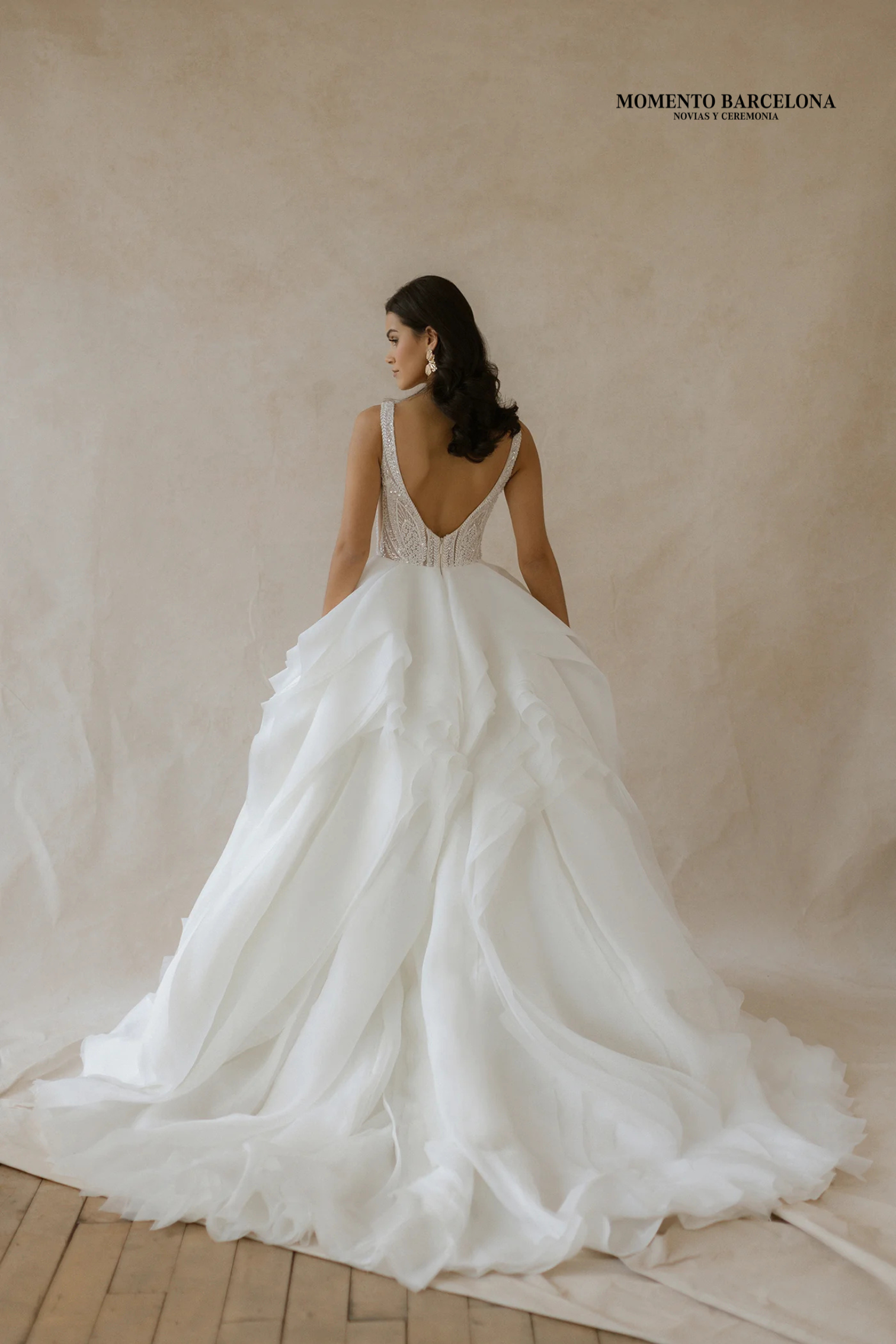 Keller es un vestido de gala dramático y texturizado, diseñado para una entrada inolvidable. El escote pronunciado en V brilla con intrincados bordados de cuentas y lentejuelas, mientras que los finos tirantes contrastan delicadamente con el volumen audaz del vestido. Capas de organza vaporosa conforman la falda amplia, que cae en cascada con suaves volantes que crean movimiento y dimensión desde cualquier ángulo. Keller es perfecto para la novia que busca un glamour impactante envuelto en una silueta romántica de inspiración alta costura.
