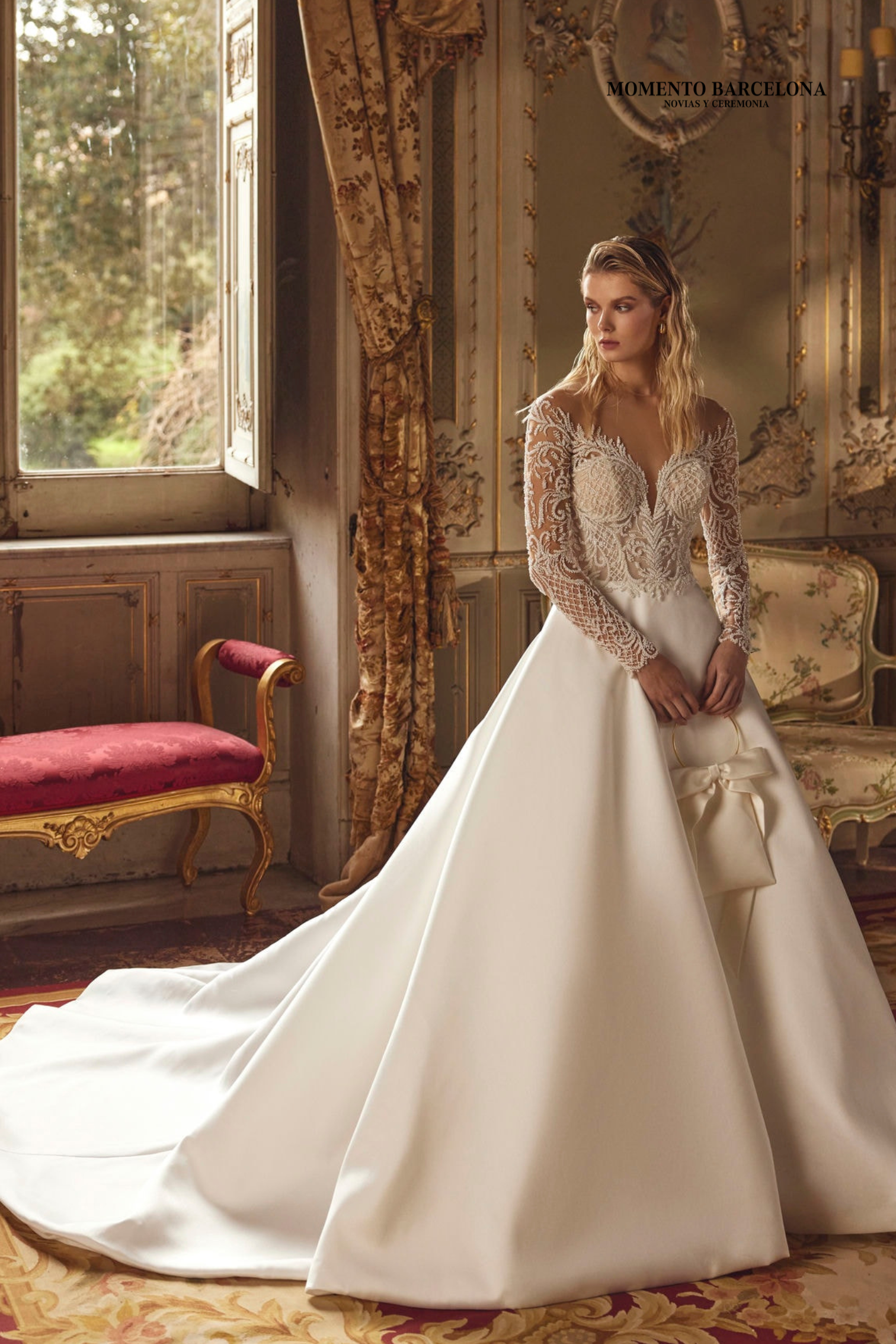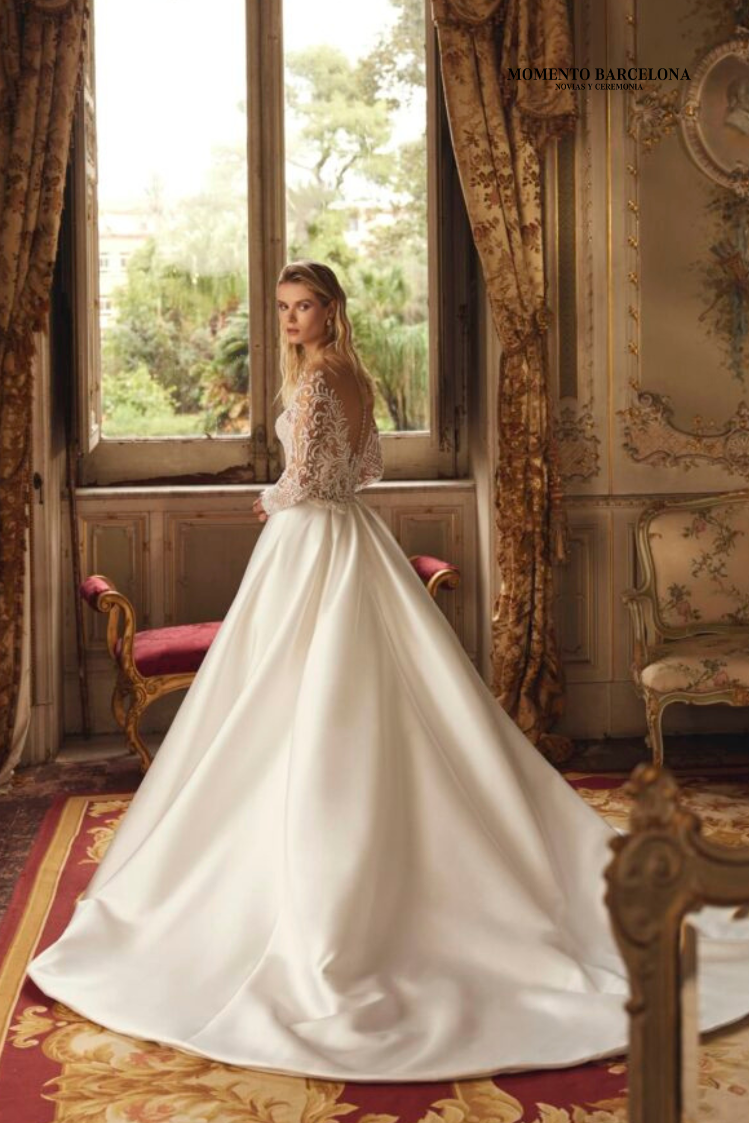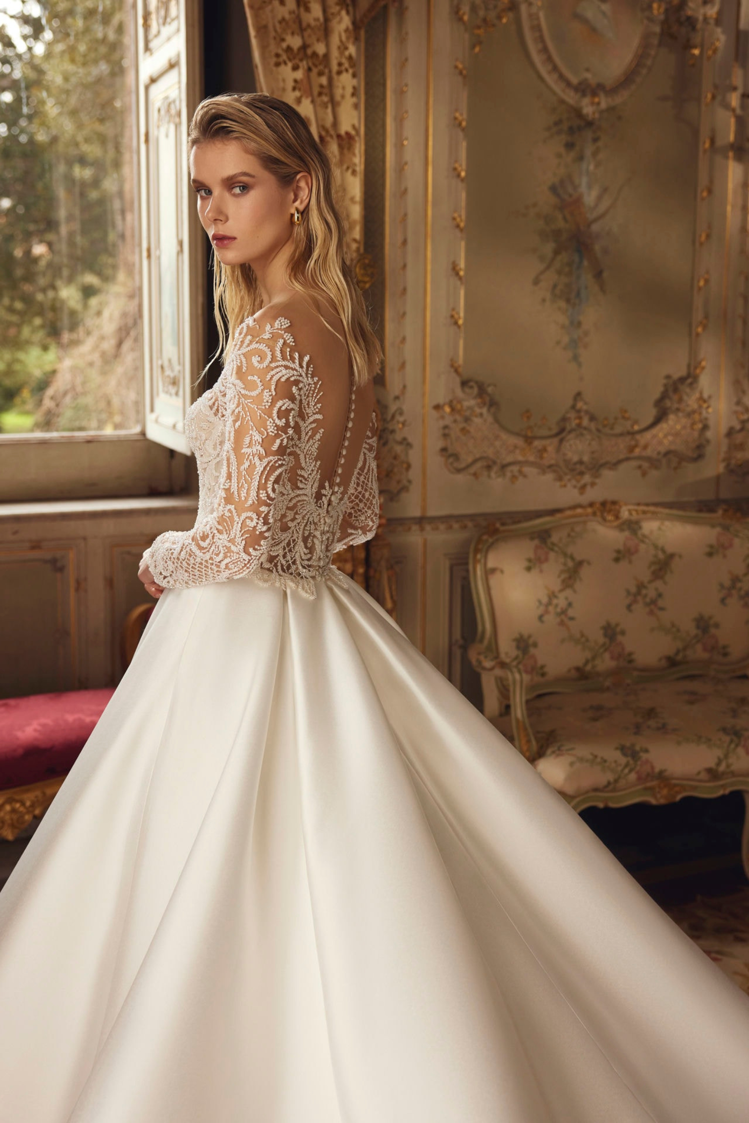 Crafted for the fashion-forward bride who embodies style and glamour, the full mikado a-line gown features a long-sleeved bodice beaded with intricate embroidery, an illusion neckline elegantly revealing the shoulders and back