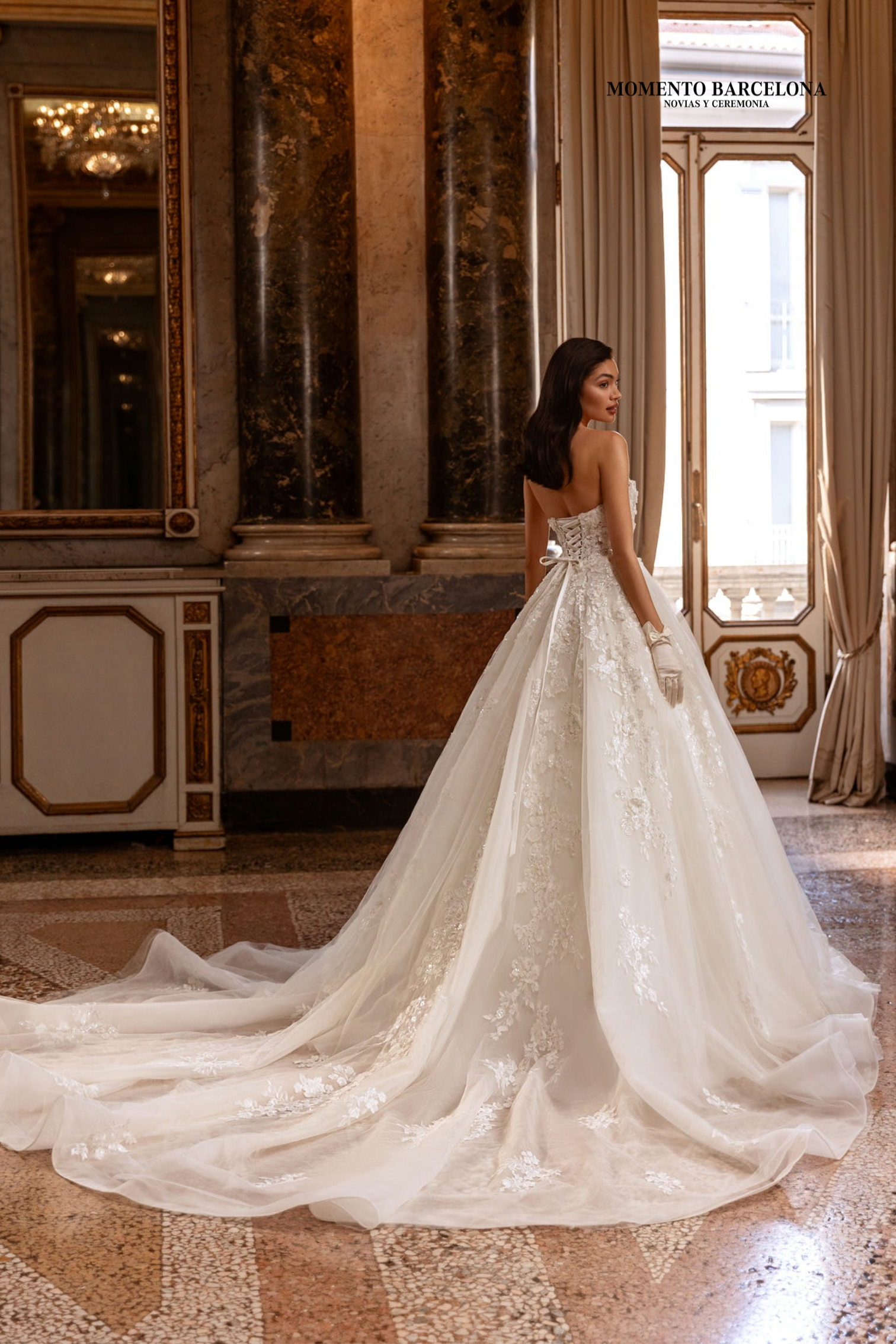 When modern chic collided with old-school charm, voilà – the Hadley gown was born! This beauty features a sleek neckline and a ball gown silhouette adorned with intricate lace and dazzling beadwork. And guess what? It even comes with removable sleeves, perfect for the bride who’s all about those choices!