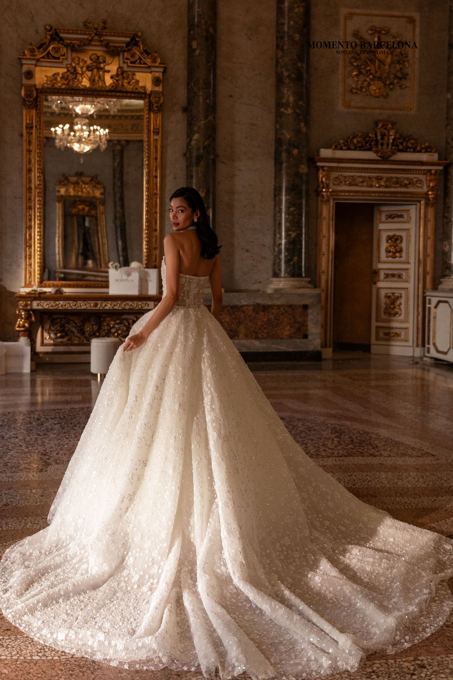 The enchanting Aspen gown showcases a corset with a scoop bodice as its focal point. This fitted top elegantly pairs with a princess ball gown skirt, all crafted from beaded tulle.