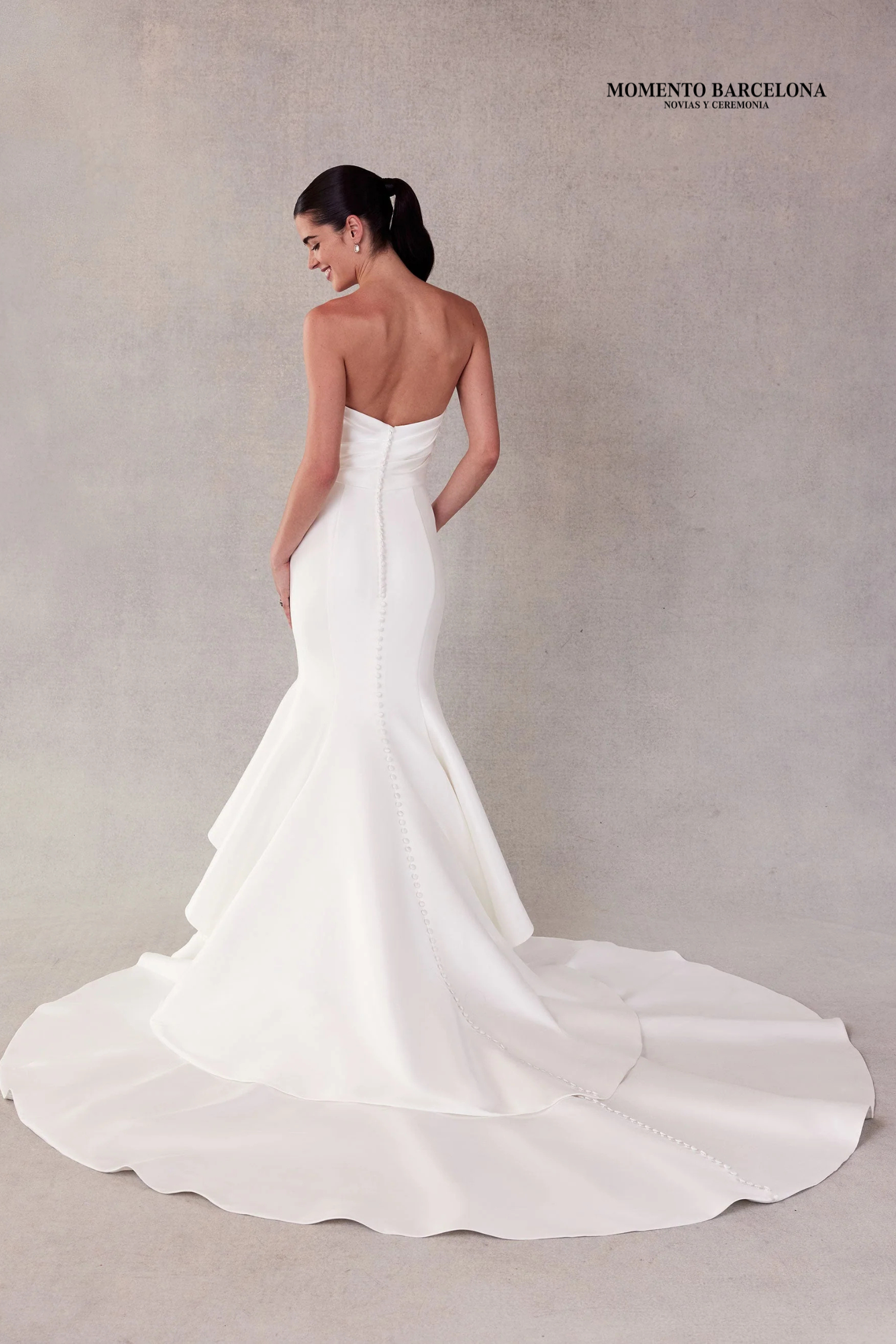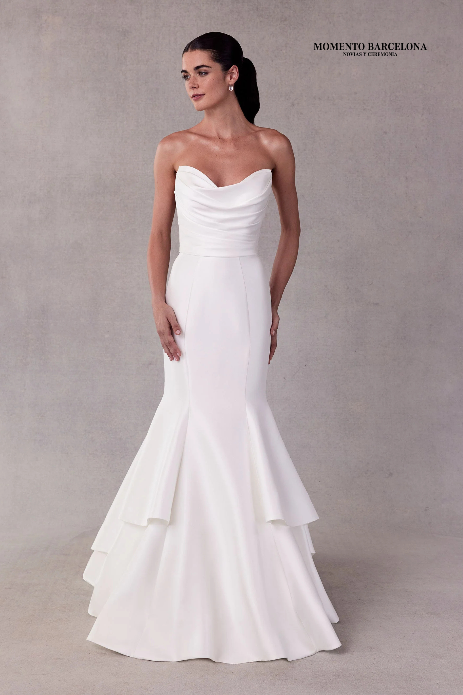Minimalist mermaid wedding dress has a draped cowl bodice with a strapless neckline on a tiered satin skirt.