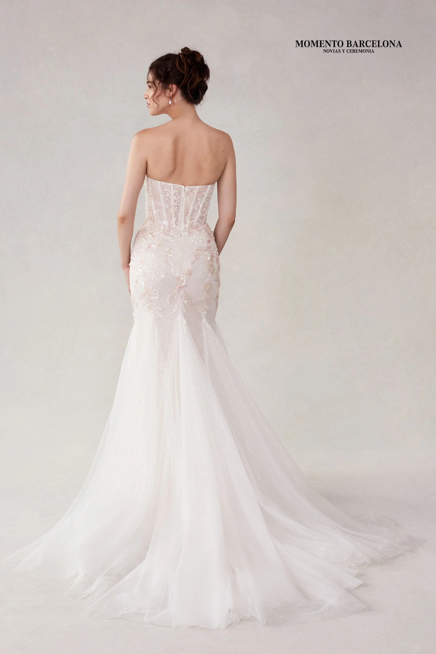 Glamorous mermaid wedding dress has a strapless sweetheart corset bodice with beaded floral appliqués and basque waist on glitter tulle.