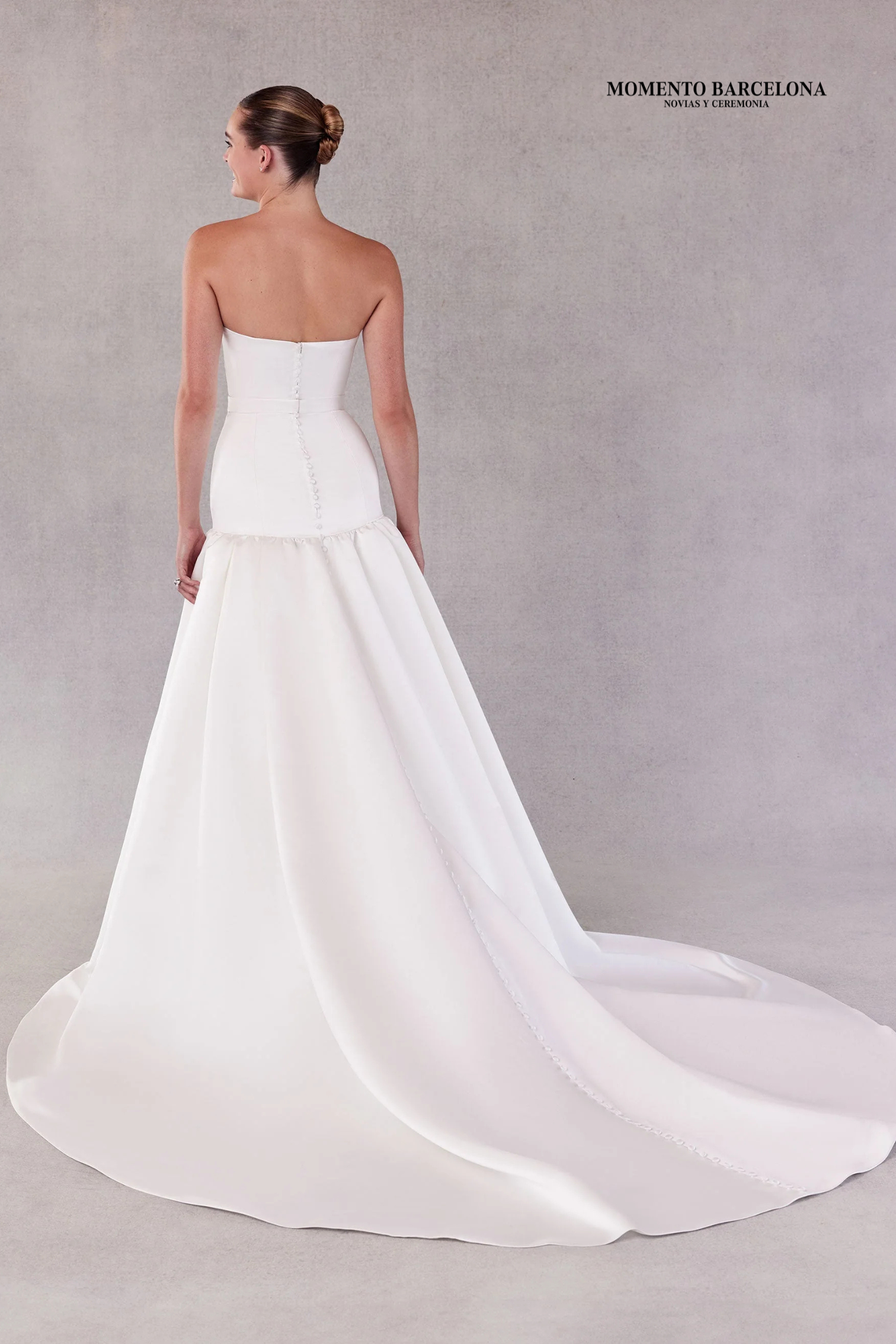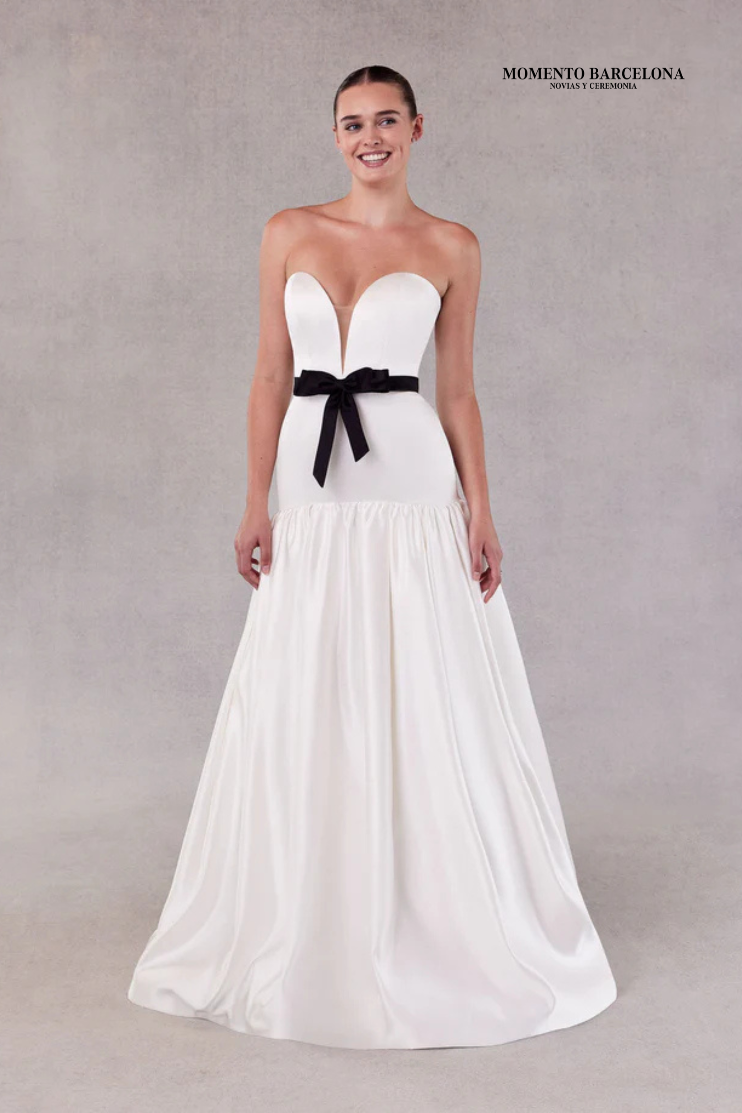 Chic wedding dress has a plunging, strapless sweetheart neckline on a drop waist ball gown silhouette with a detachable bow belt in satin.