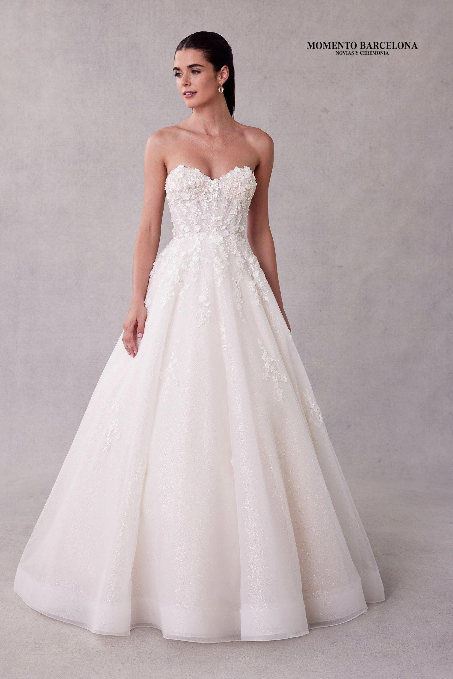 Impresionante vestido de baile con un escote de corazón sin tirantes sobre un corpiño de tul drapeado con encaje de cuentas sobre una falda de red brillante en forma de A.