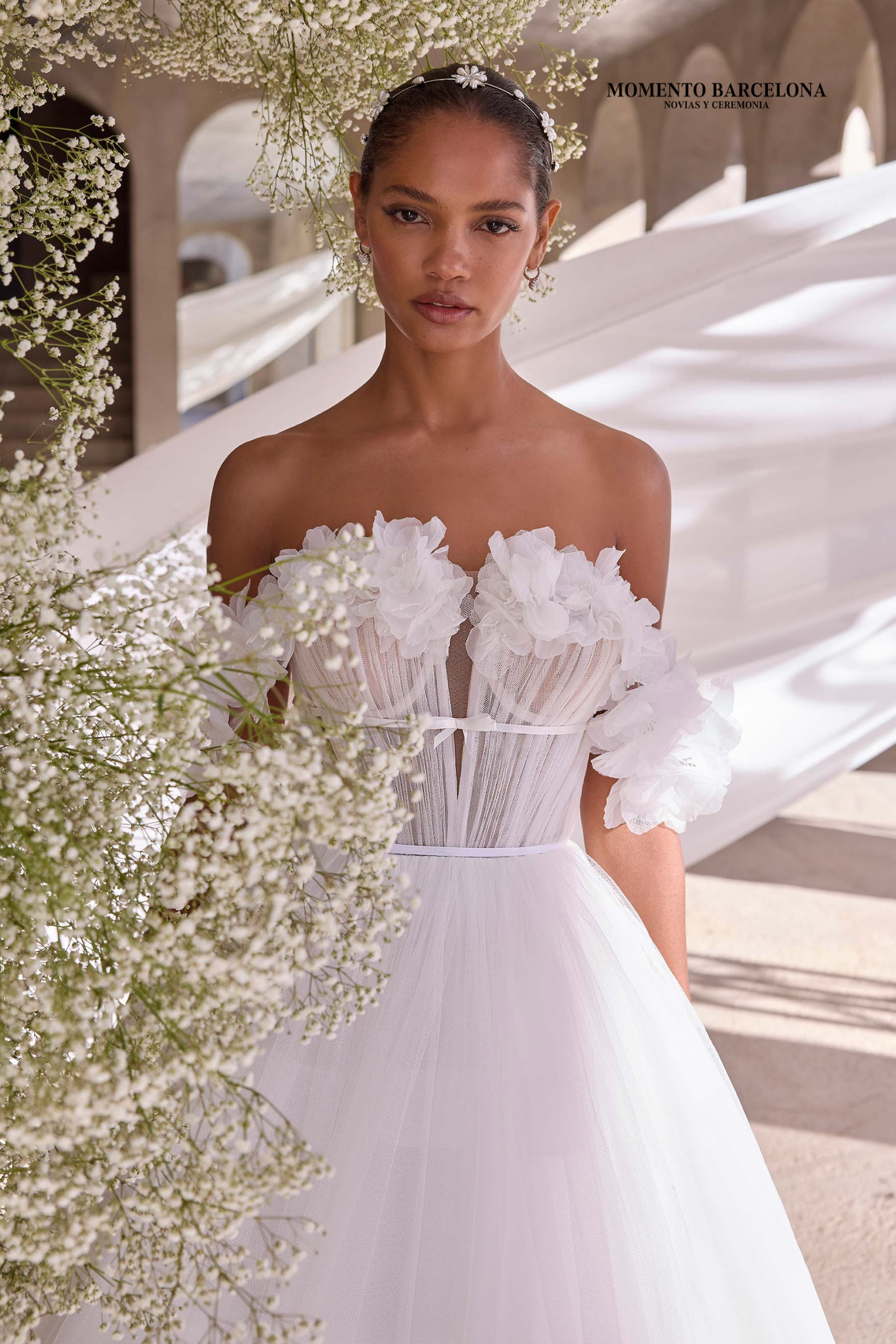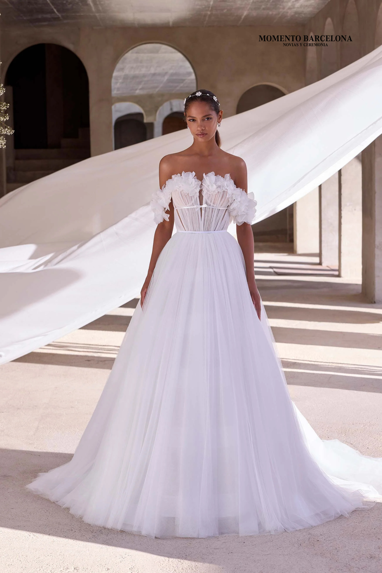 Vestido de novia de corte A en tul fruncido y organza con escote pronunciado, mangas con hombros descubiertos con flores 3D y un lazo de satén.