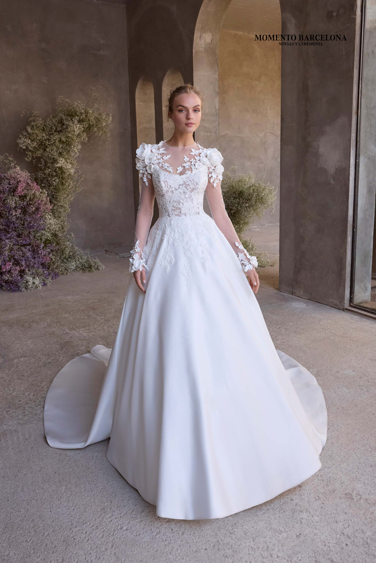 El vestido de novia estilo gala tiene un corpiño de encaje con un escote redondo estilizado de ojo de gato y una flor 3D desmontable sobre una falda de satén.