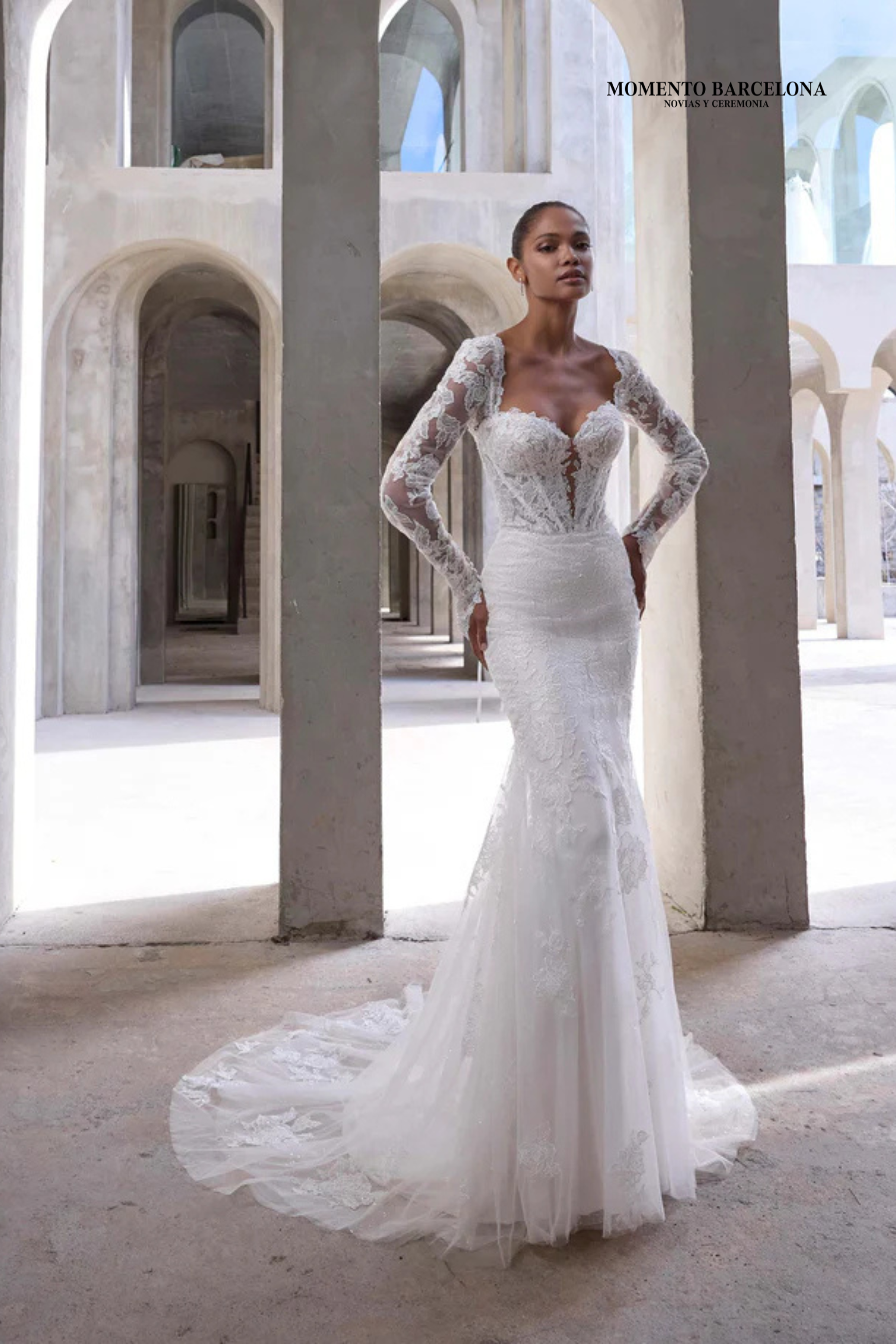 El vestido de novia entallado y con vuelo tiene un corpiño corsé pronunciado con escote en forma de corazón y mangas largas desmontables con lazo en la espalda en encaje con lentejuelas.