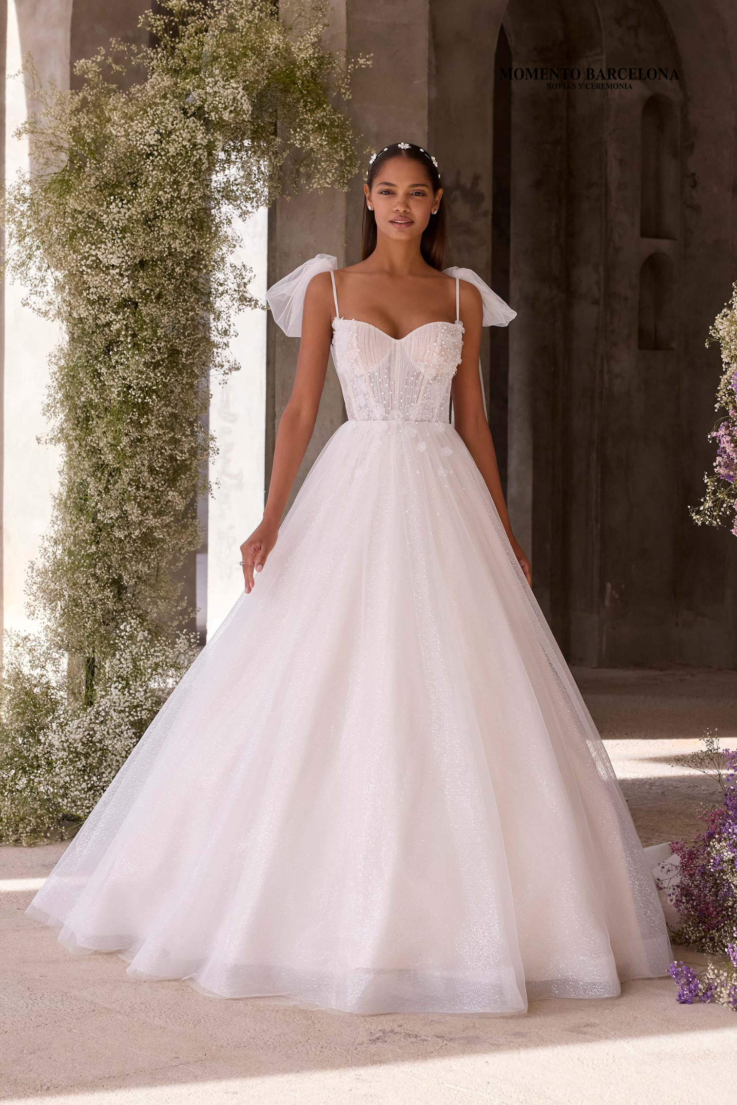 El vestido de novia de corte A tiene un escote en forma de corazón y tirantes de organza hasta el suelo con lazo sobre un corpiño transparente y plisado con aplicaciones florales en tul brillante.