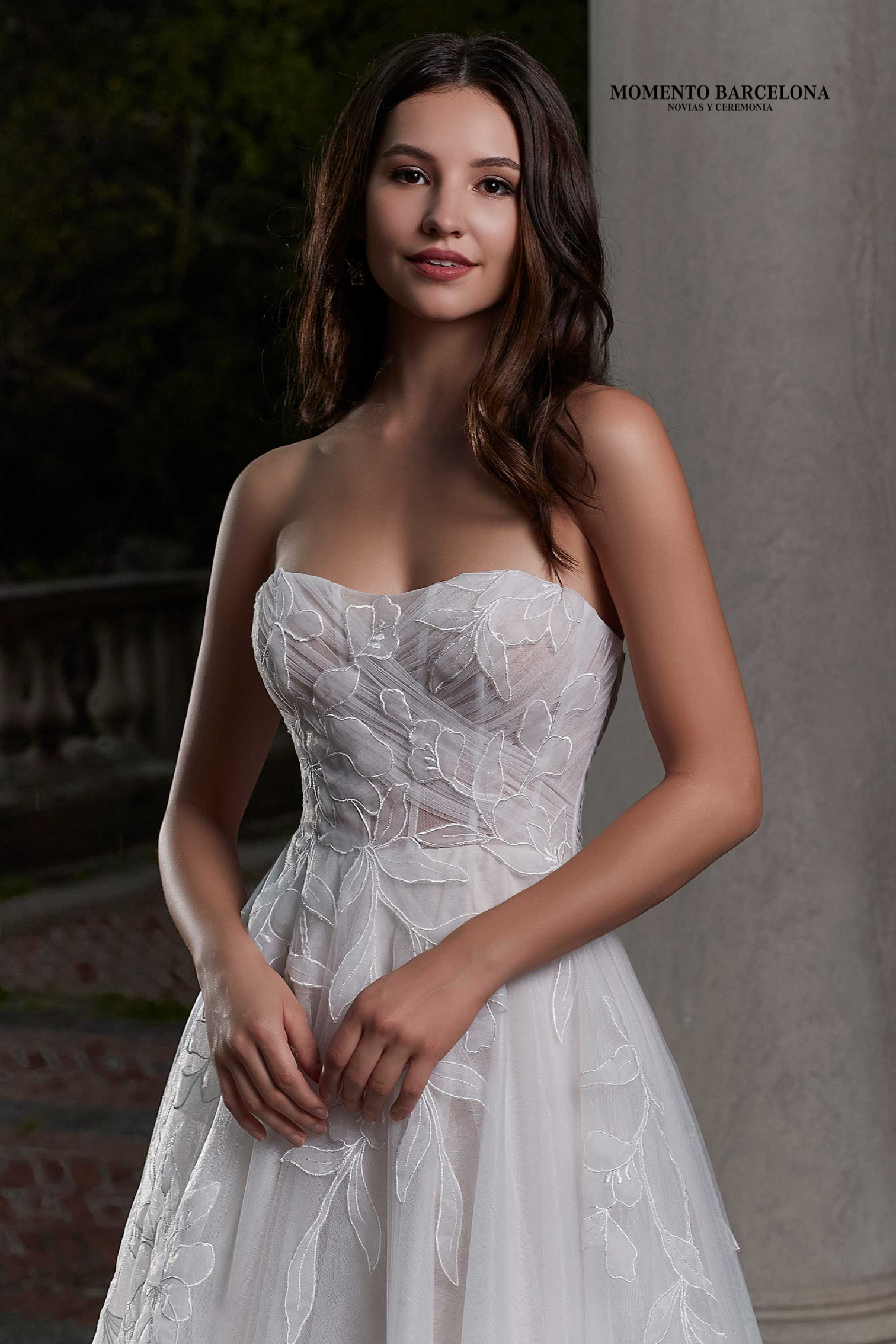 El vestido de gala de ensueño tiene un corpiño deshuesado con drapeado asimétrico y bordado floral de organza.