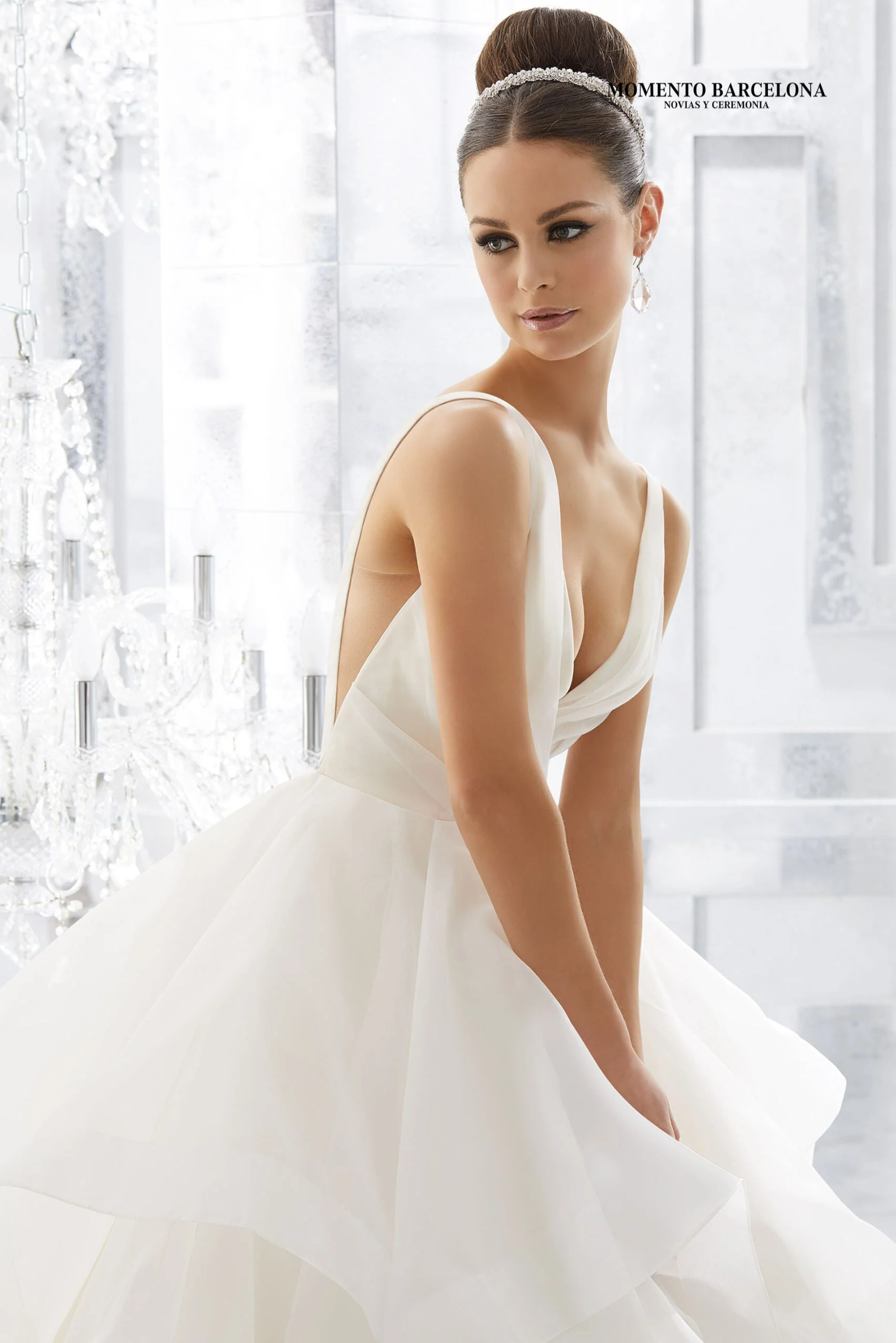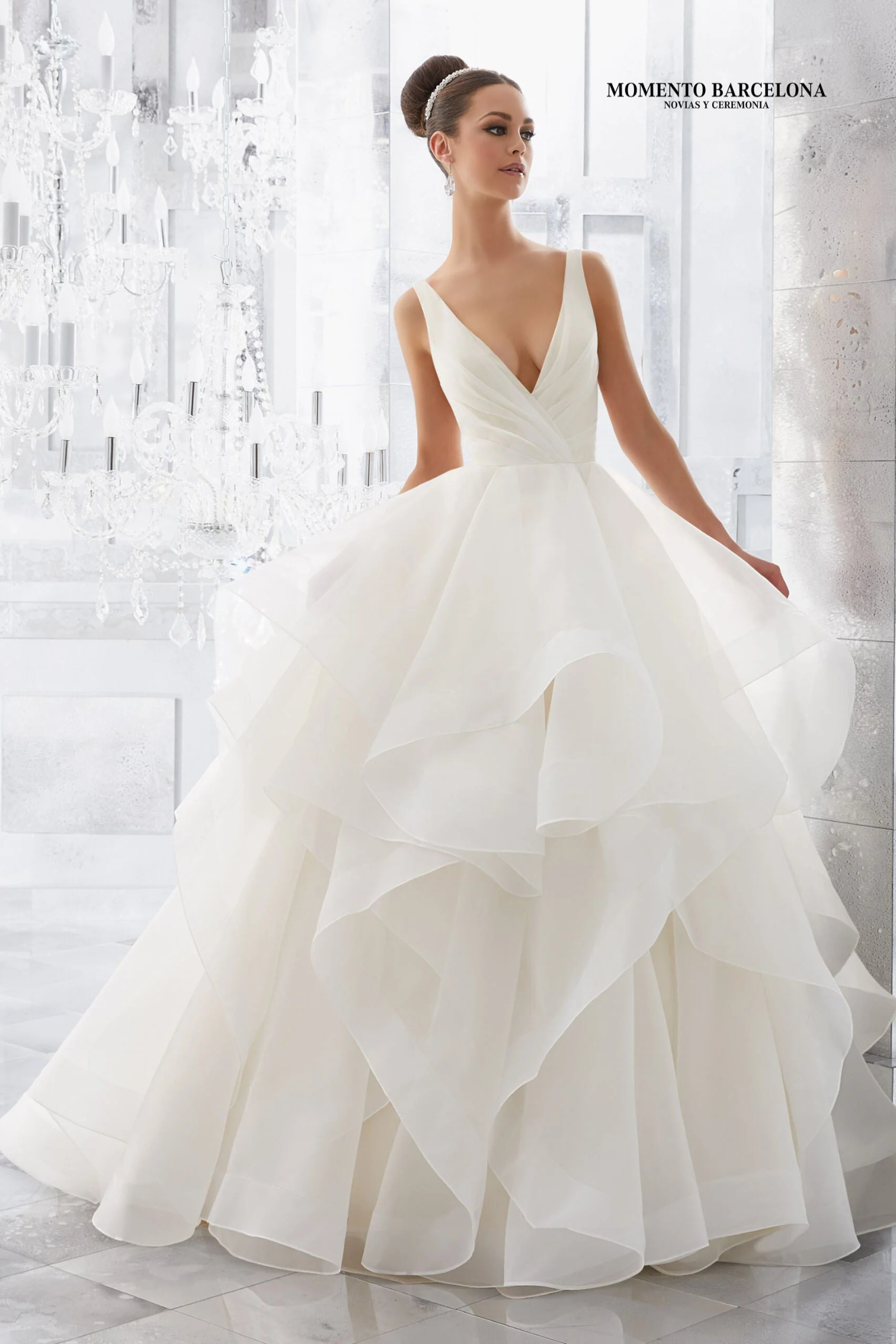 Hermoso vestido de baile con un corpiño drapeado con un escote en V pronunciado y una espalda en V abierta a juego sobre una impresionante falda de organza con volantes.